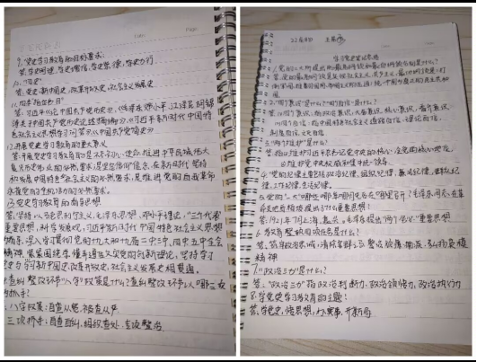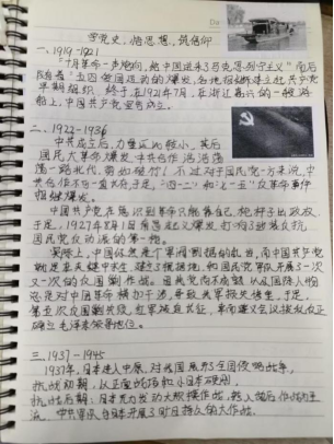 广大物理公司青年学子踊跃报名,积极参加,翻阅各种资料了解党史,在此过程中提高了自己的思想境界。本次活动分为两个阶段,第一步为同学们自主查找并学习有关党史的内容。第二步为同学们在学习后完成学习笔记并按时分享。本次活动以线上形式开展,同学们认真学习有关党史的内容,了解党的光辉历程,并按时分享学习笔记。从同学们提交的作品中,我们看到了同学们对党史了解的程度,同时爱国主义思想也更加坚固地植入了同学们的心中。涌现了一批以王睿童、李忆璇、刘静蕾等同学为代表的优秀作品。这些同学的学习笔记字迹工整,笔记内容丰富,对不同主题进行了划分。条理分明,逻辑清晰。其中王睿童的学习笔记内容深刻,可以看出该同学在学习党史之后进行了深入的反思总结,我们看到了她思想的深度和对信仰的认识。高森同学的学习笔记不仅有对学习内容的总结分析,同时还搜集了与党的光辉历史有关的图画。笔记工整,分析内容深刻,值得我们为他点赞。刘静蕾同学的学习笔记对重点内容用不同颜色标出,美观大方。王若彤同学的笔记,总结了“四个意识”和“两个维护”的概念,可以看出她认真学习了党史,同时分点清晰,字迹清楚。