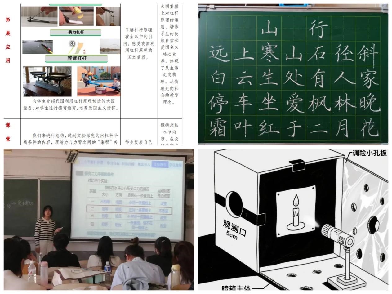 本次师范生素质大赛设置讲课、二笔字、教学设计(教案)、教具设计四个赛道。讲课赛道中,参赛者同台竞技、切磋交流,展开了激烈比拼;二笔字赛道里,参赛者笔走龙蛇,粉笔字刚劲洒脱、钢笔字飘逸俊秀,引得众人称赞;教学设计(教案)赛道上,参赛者匠心独运,教学构思新颖独特;教具设计赛道中,参赛者创意迸发,作品尽显创新思维。评委老师们也针对同学们存在的问题提出改进建议,为参赛者的未来发展指明方向。