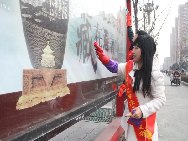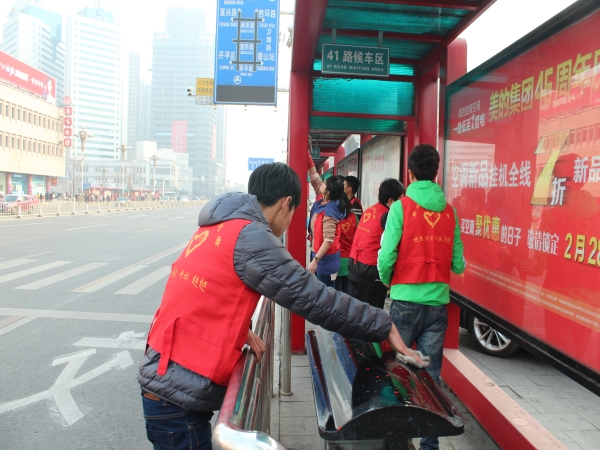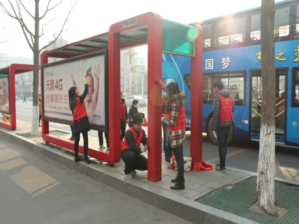2014年3月4日下午,我系的员工党员、入党积极分子、员工干部组成了一支100人的青年志愿者队伍,他们自备清洁工具为我市建设路沿线的公交汽车候车亭清除小广告,清洁站牌、广告牌,让我们的城市亮起来;同时,志愿者们认真宣传、倡导绿色出行,呼吁市民多乘公交车,低碳环保,让我们的天空亮起来。志愿者们不畏寒冷,为市民营造洁净的出行环境,他们用自己的实际行动诠释了社会主义核心价值观;他们用自己的实际行动告诉我们,只要每个人付出一点,我们就会建成“居者心怡,来者心悦”的靓丽唐山!
